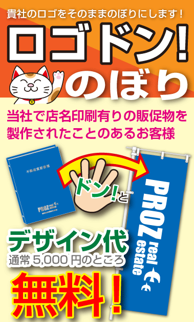 ※ロゴドン!のぼり/横幕は、不動産ファイルなどを製作時に使用したロゴデータを縦向きに回転させた場合のみデザイン無料適応となります。